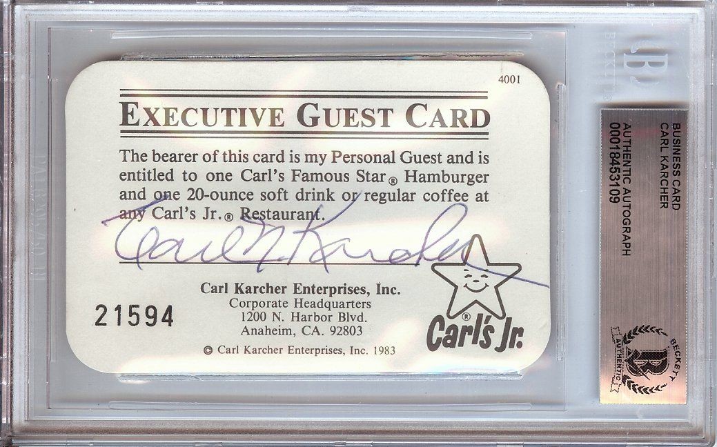 Carl Karcher Signed Autographed Business Card Carl's Jr Guest Card BAS 3109